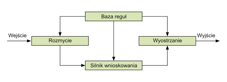 Regulator rozmyty składa się w związku z tym z czterech komponentów. Są to bloki: rozmywania (fuzyfikacji), bazy reguł (wiedzy), silnika wnioskowania oraz wyostrzania (defuzyfikacji) (rys. 3).