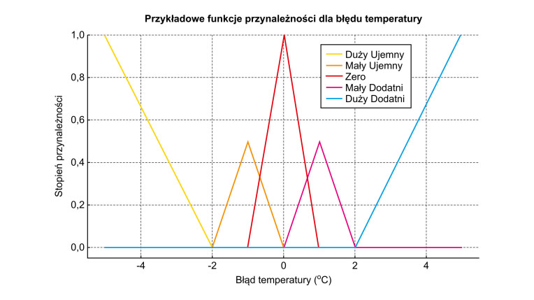 Załóżmy, że zadaniem regulatora mocy grzałki jest utrzymanie temperatury w pokoju na poziomie +22°C. Jeżeli różnica między temperaturą zadaną a zmierzoną jest dodatnia, oznacza to, że jest za zimno i pomieszczenie trzeba dogrzać. W przeciwnym razie jest za ciepło, więc trzeba ograniczyć grzanie. Zmienną wyjściową w tym układzie jest moc grzania wyrażana jako procent maksymalnej mocy grzałki (0% – 100%). Wartości błędu można przypisać do następujących zbiorów rozmytych: duży ujemny (bardzo gorąco), mały ujemny (lekko za gorąco), zero (w sam raz), mały dodatni (lekko za zimno) i duży dodatni (bardzo zimno). Wykresy przykładowych funkcji przynależności dla poszczególnych zbiorów przedstawiono na rysunku 4. Wynika z nich, że błąd +3°C należy głównie do zbioru duży dodatni, +0,5°C – częściowo do mały dodatni, częściowo do zero, a –4°C głównie do duży ujemny. Każda reguła if – then w bazie przypisuje moc grzania w zależności od rozmytej wartości błędu.