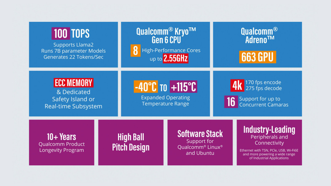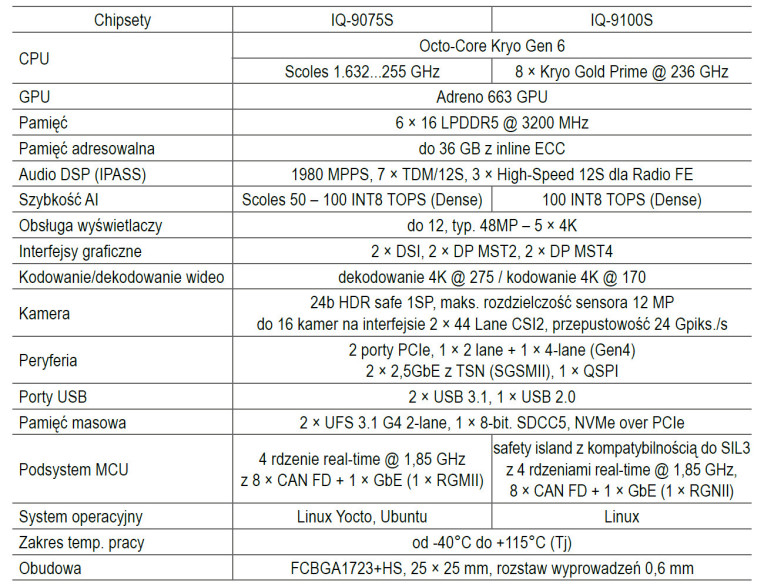 Przewidując rosnące zapotrzebowanie na systemy automatyzacji, oparte na sztucznej inteligencji, firma Qualcomm Technologies opracowała serię układów SoC Dragonwing IQ9 do aplikacji Edge AI, wymagających maksymalnej skalowalności i mocy obliczeniowej. Mogą one znaleźć zastosowanie m.in. w maszynach przemysłowych, bramkach sieciowych, dronach, robotyce oraz wszędzie tam, gdzie priorytetem jest bezpieczeństwo, niezawodność i moc obliczeniowa. Zapewniają dużą wydajność zaawansowanych modeli AI przy bardzo małym poborze mocy. Mogą pracować w aplikacjach o znaczeniu krytycznym, oferując mechanizmy wykrywania błędów i bezpieczeństwa funkcjonalnego w czasie rzeczywistym. Są układami o niezawodności klasy przemysłowej z gwarantowaną co najmniej 10-letnią dostępnością i rozszerzonym wsparciem oprogramowania dla wielu systemów operacyjnych.