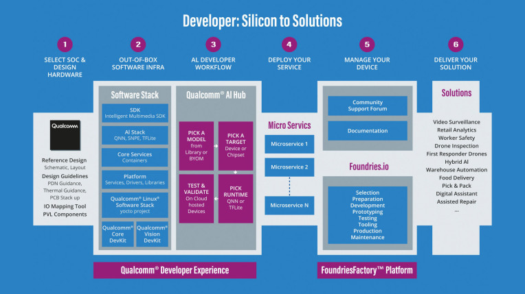Jeśli chodzi o oprogramowanie, firma Qualcomm uruchomiła inicjatywę Qualcomm Developer Network, umożliwiającą projektantom tworzenie i wdrażanie aplikacji Edge AI w oparciu o najnowsze układy SoC z jej oferty. W ostatnich latach Qualcomm poczynił znaczne inwestycje w dostarczanie kompleksowego pakietu oprogramowania, począwszy od systemu operacyjnego, poprzez pakiety SDK dla programistów (rozpoznawanie obrazów, sztuczna inteligencja i robotyka), aż po narzędzia i przepływy pracy w zakresie wdrażania sztucznej inteligencji, usprawniające proces rozwoju i umożliwiające klientom szybsze wdrażanie aplikacji.