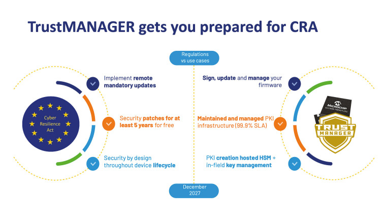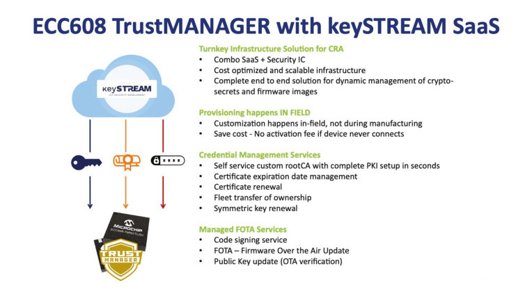 Dzięki możliwościom wdrażania uwierzytelnień bezpieczeństwa w miejscu instalacji, aktualizacji oprogramowania sprzętowego bezprzewodowo (FOTA) i dynamicznemu zarządzaniu cyklem życia urządzenia, platforma oprogramowania jako usługi (SaaS) Microchip TrustMANAGER z Kudelski keySTREAM oferuje kompletne i wydajne podejście do osiągnięcia zgodności z wymogami cyberbezpieczeństwa, takimi jak CRA.