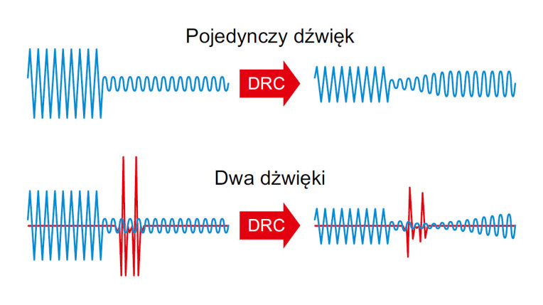 Standardem w nowoczesnych aparatach słuchowych jest zastosowanie kompresji zakresu dynamiki dźwięku (Dynamic Range Compression, DRC). Automatycznie dostosowuje ona wzmocnienie, aby ciche dźwięki pogłośnić, a te głośne ściszyć. Jest to kluczowy algorytm przetwarzania sygnałów w aparatach słuchowych. Niestety może on również powodować zniekształcenia i wzmacniać hałasy tła. Przez to jakość dźwięku w głośnym otoczeniu się pogarsza.