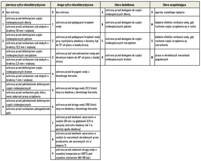 - pierwsza cyfra charakterystyczna – określa poziom szczelności obudowy przed wnikaniem ciał stałych do jej wnętrza,