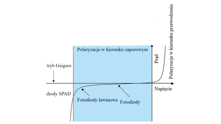Dla przypomnienia (rys. 1) – fotodiody zazwyczaj pracują przy polaryzacji w kierunku zaporowym. Fotodiody lawinowe działają w zakresie charakterystyki prądowo-napięciowej, gdzie wzmocnienie zmienia się wykładniczo wraz ze wzrostem napięciem polaryzacji, blisko napięcia przebicia złącza. Dzięki temu osiągają wzmocnienia typowo od 2 do 10 tys. Diody SPAD natomiast pracują w tzw. trybie Geigera, czyli przy napięciu polaryzacji przekraczającym napięcie przebicia złącza (napięcie polaryzacji jest w praktyce ograniczone przez wytrzymałość struktury złącza). Pozwala to uzyskać niemal nieskończone wzmocnienie, a każdy pojedynczy foton wywołuje pełny impuls prądu lawinowego. Wyjaśnienie specyfiki diod SPAD warto poprzedzić przypomnieniem podstaw pracy "zwykłych" fotodiod lawinowych.