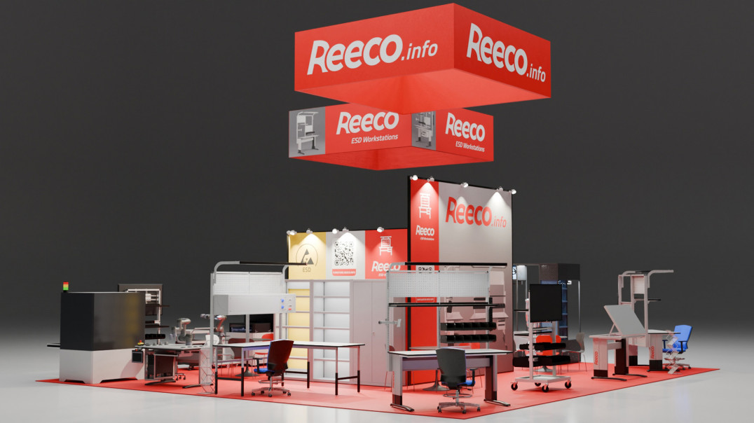 Znaczną część ekspozycji poświęcono również organizacji stanowisk pracy w strefach EPA. Zaprezentowane zostaną konfiguracje mebli antystatycznych Reeco – w tym stanowisko oparte na konstrukcji CLASSIC z nadstawką, szafą RACK i oświetleniem LED oraz najnowsza generacja stołów PREMIUM ELECTRIC PLUS z elektryczną regulacją wysokości i podwyższoną nośnością, dostosowaną do pracy zarówno w pozycji siedzącej, jak i stojącej. Modułowa architektura systemu ułatwia budowanie ergonomicznych miejsc pracy „pod proces” – od pojedynczych stanowisk montażowych, przez stoły do wiązek kablowych, po zintegrowane ciągi robocze z elementami transportu wewnętrznego. Prezentację uzupełni stanowisko konferencyjne Reeco z uchwytem TV, pełniące funkcję kompaktowego punktu informacyjnego, w pełni kompatybilnego z pozostałymi modułami systemu.